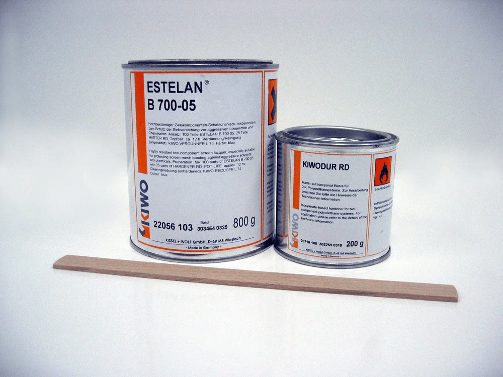 KIWODUR RD is the hardener used with ESTELAN 700. Mix ESTELAN 700 in a 4:1 weight ratio with KIWODUR RD by mixing 100 parts ESTELAN 700 and 25 parts HARDENER RD. After stirring thoroughly, the lacquer can be applied with a brush or a coating trough.