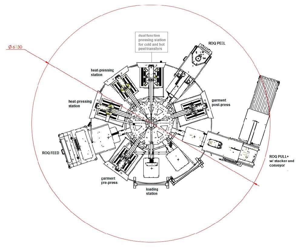 Κάτοψη της πλήρους εγκατάστασης: ξεκινώντας από το σταθμό φόρτωσης, ακολουθούμενη από το pre-press, ROQ FEED, δύο σταθμούς θερμομεταφοράς, ένα σταθμό διπλής λειτουργίας για θερμή και ψυχρή αφαίρεσης φιλμ, post-press, ROQ PEEL, και καταλήγοντας στο ROQ PULL+ με στοιβαχτή και μεταφορέα. Μια βελτιστοποιημένη, αυτοματοποιημένη ροή εργασίας για εφαρμογές DTF και θερμομεταφοράς.