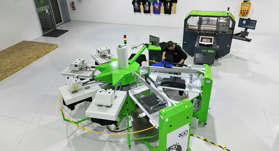 ROQ READY is na automatic pretreating machine with 8 stations, that combines pretreat, heat press and flash cure units. This machine allows an efficient workflow when combined with ROQ GO, a DTG single pallet machine.