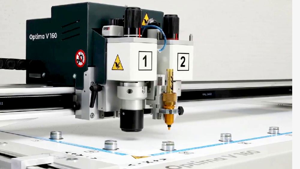 Το μοντέλο Optima V1612 που επιλέχθηκε, είναι ένα κόμπακτ σύστημα με σχήμα τραπεζιού 160 x 123cm, ιδανικό για μικρούς χώρους παραγωγής και για επεξεργασία κουτιών αλλά και σταντ. Είναι κατάλληλο για κοπή,χάραξη, πίκμανση & σχεδίαση, για υλικά πάχους έως 20mm – μάλιστα είναι ειδικά σχεδιασμένο για κοπή V-cut σε γκρι συμπαγές χαρτόνι (greyboard). Οι ανεξάρτητες κεφαλές μπορούν να ρυθμιστούν εύκολα για διαφορετικά πάχη υλικών με αλλαγή στον τύπο και μήκος του μαχαιριού που χρησιμοποιείται. Το μηχάνημα διαθέτει στάνταρ κάμερα για ανάγνωση σημαδιών κοπής. Το σύστημα της κάμερας, σε συνδυασμό με το προαιρετικό software OptiCrop, προσφέρει περιγραμματική κοπή ακριβείας σε προτυπωμένα υλικά.